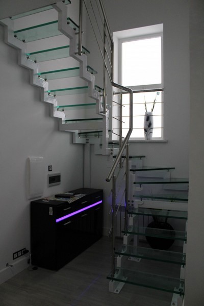 В качестве ступеней может использоваться дерево или закаленное стекло. Стоимость того или иного варианта трудно сравнивать, так как часто лестницы на заказ могут комплектоваться деревом редких пород, что существенно влияет на конечную цену. Если выбирать практичные и относительно доступные породы, они будут дешевле стекла.